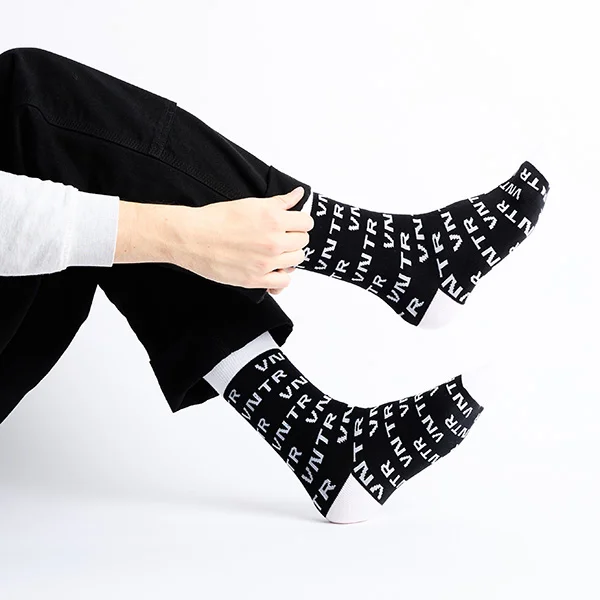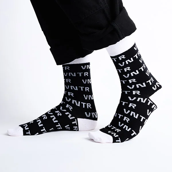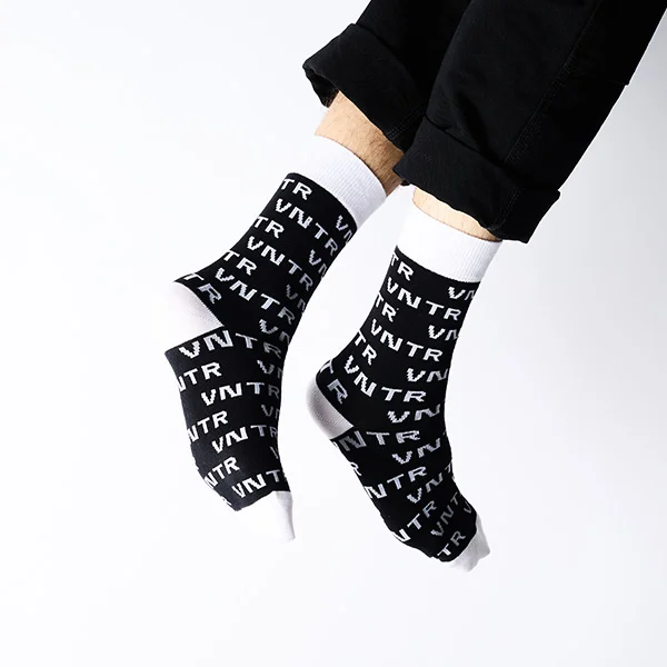Hergestellt in Europa, vereinen die VNTR Socken höchste Qualität und zeitlosen Stil. Das kontrastreiche Schwarz-Weiss-Design mit dem VNTR-Logo steht für kreative Visionen und Innovationskraft – ganz nach unserem Motto: «We always challenge the status quo. Even the standard of business socks.» Material: 92% Baumwolle, 5% Polyamid, 3% Elasthan